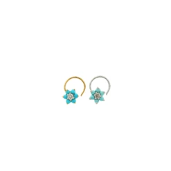 This 18ct Gold Diamond & Turquoise Cluster Nose Stud offers timeless style that seamlessly transitions from casual outings to formal gatherings. The classic design, enhanced by the blend of rich gold, dazzling diamonds, and bright turquoise, presents a versatile appeal which suits any aesthetic preference. Whether you’re dressing for a meeting or an evening out, this nose stud is the perfect piece to add to your outfit. In a world where jewellery trends constantly evolve, invest in a piece that remains eternally fashionable.