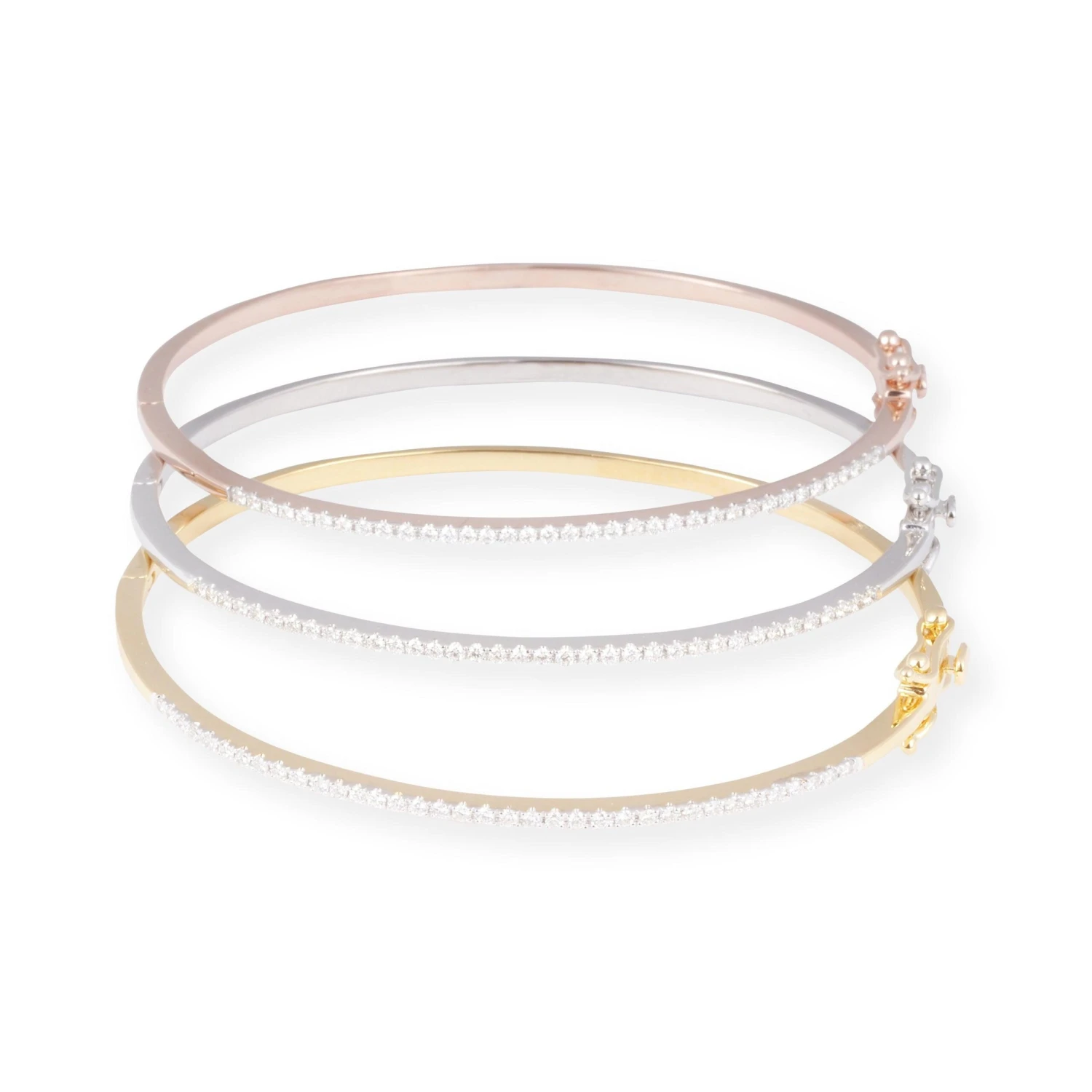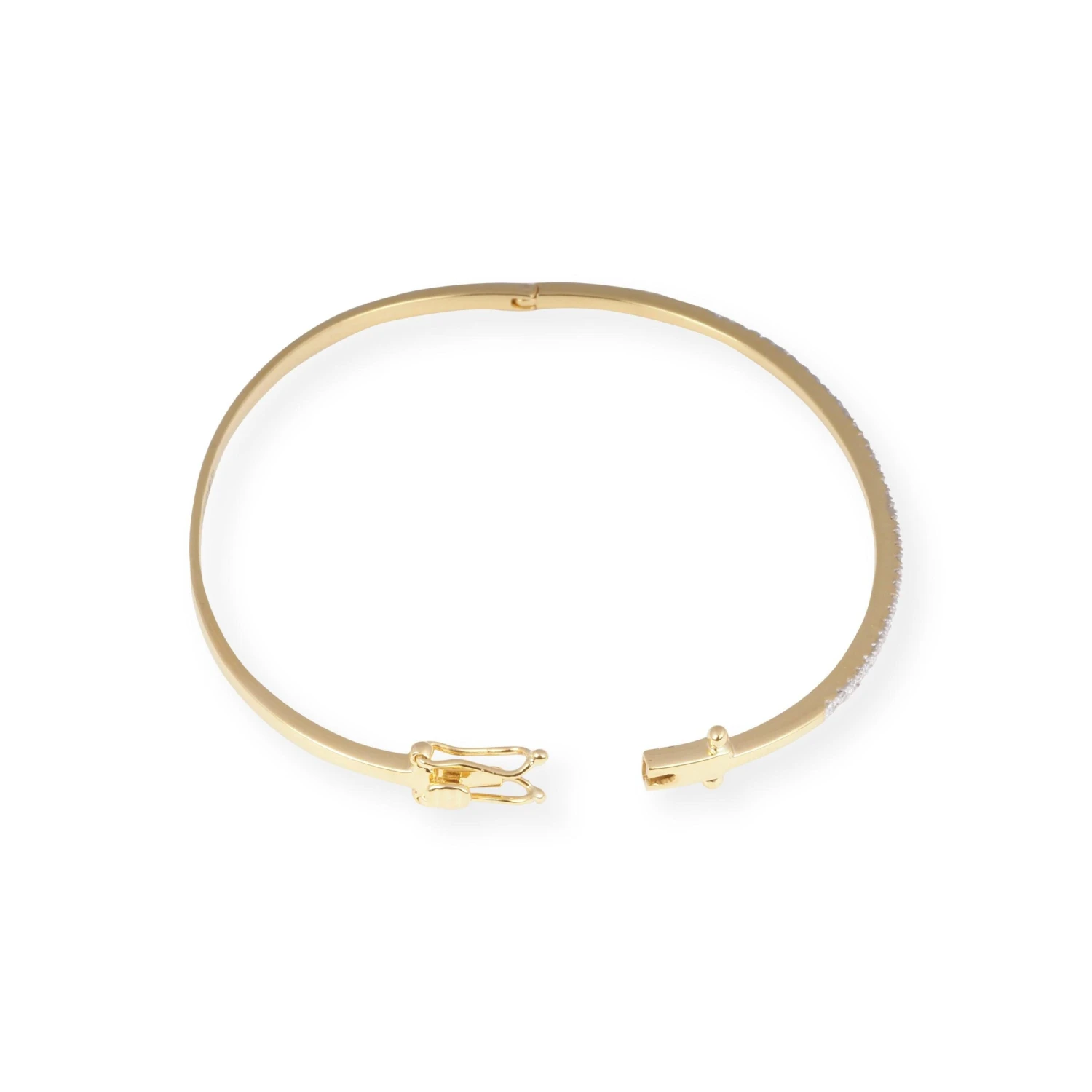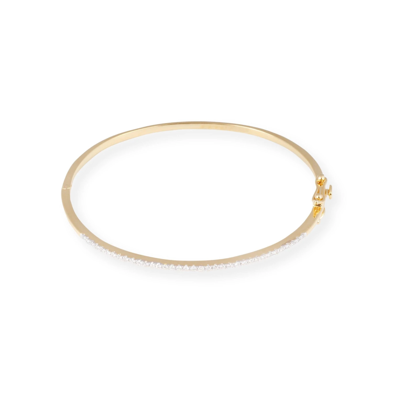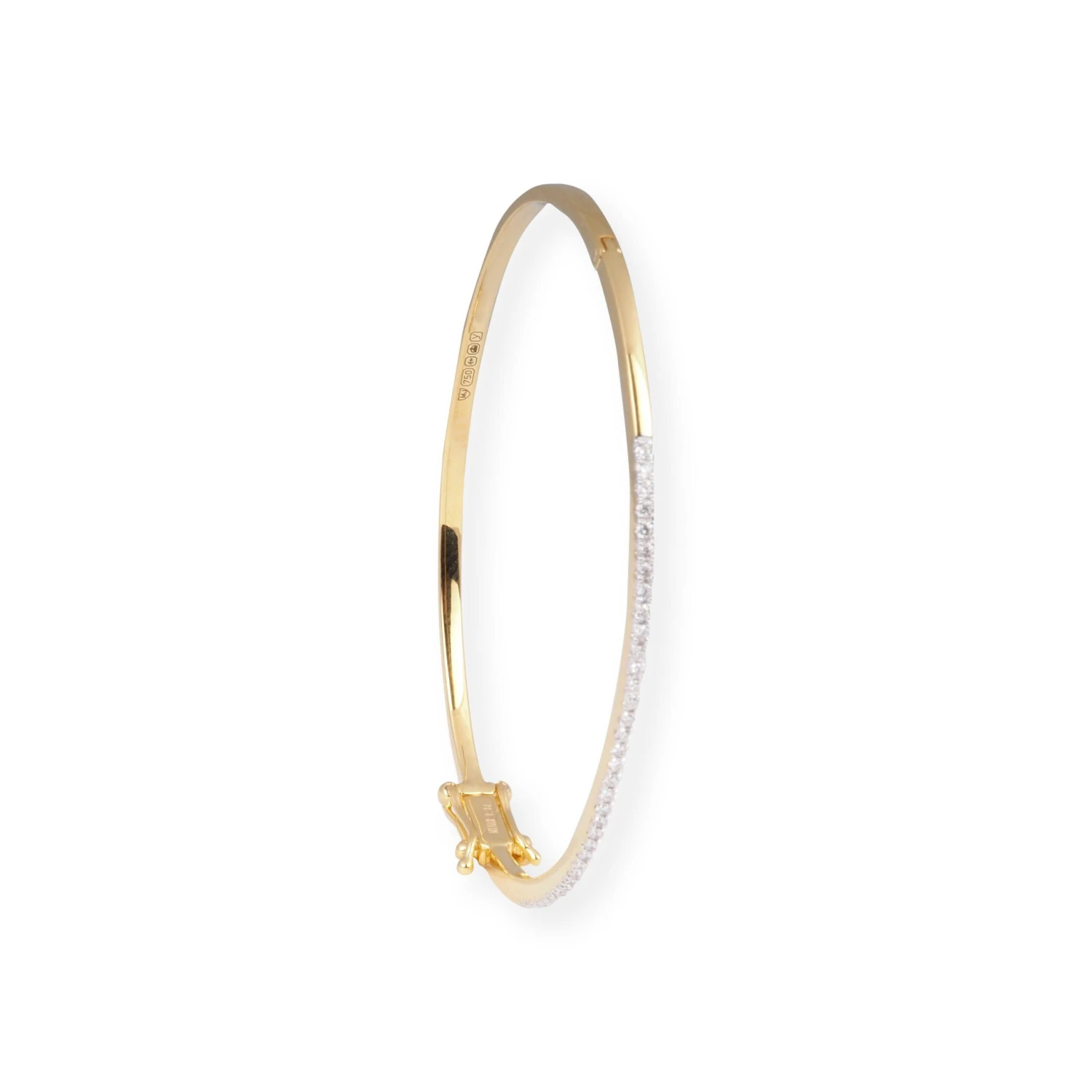 This timeless gold bangle with diamonds combines the classic allure of 18ct gold with a contemporary openable design. The bangle’s innovative clasp allows for easy wear while maintaining a secure fit, making it a practical yet sophisticated choice for any jewellery collection. Its versatile design complements both traditional and modern outfits, making it an ideal gift for yourself or a loved one.