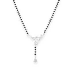This 18ct white gold mangalsutra necklace features an elegant drop pendant adorned with sparkling diamonds, adding graceful movement and brilliance. Designed to merge tradition with contemporary style, it is a luxurious piece of bridal jewellery that symbolises love and timeless elegance.