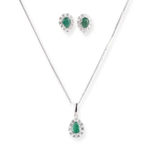 Elegant and timeless, this 18ct white gold pendant suite showcases the vivid beauty of emeralds paired with the brilliance of diamonds. The pendant and coordinating earrings are crafted to enhance the rich green hues, offering a striking contrast against the cool white gold. A sophisticated set ideal for special occasions or treasured gifting.