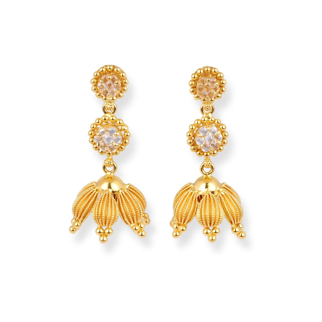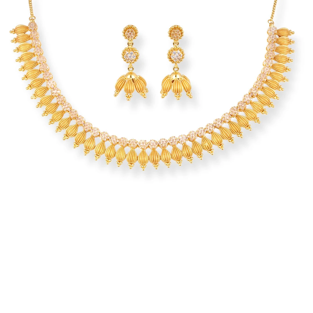A radiant 22ct gold suite designed to captivate, this necklace is embellished with sparkling cubic zirconia stones that mimic the brilliance of diamonds. The intricate craftsmanship highlights every detail, while the secure hook clasp ensures both comfort and confidence. A striking ensemble that brings together elegance and versatility for any occasion.
