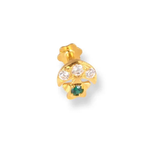 18ct Yellow Gold Screw Back Crescent And Star Nose Stud With Three White And One Green Cubic Zirconia Stones.